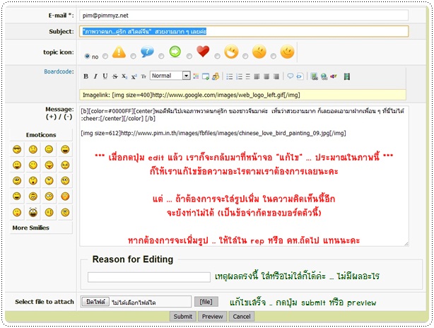 พิม.....ทดลองพิมพ์ข้อความ ปรับแต่งตัวอักษรนิดหน่อย และ Attach รูปใส่ลงไป เพื่อเป็นตัวอย่าง ... แล้วพิมก็กดปุ่ม Submit