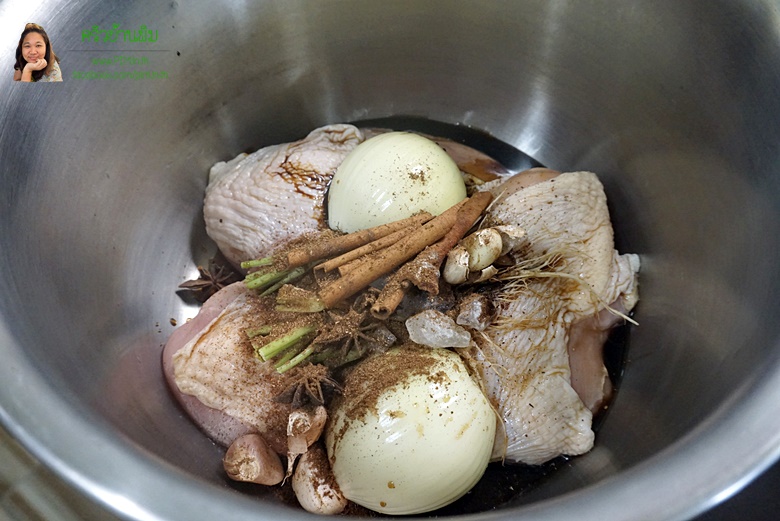 ต่อมาก็หยิบอกไก่ที่ล้างสะอาดและพักให้สะเด็ดน้ำแล้ว ใส่ลงในหม้อที่เราจะตุ๋นไก่ค่ะ ตามด้วยหอมใหญ่หัวใหญ่ ปอกเปลือก+ผ่าครึ่ง รากผักชี พริกไทยดำ เกลือป่น น้ำตาลกรวด ซีอิ๊วดำ ซีอิ๊วขาว ซอสปรุงรส นะคะ