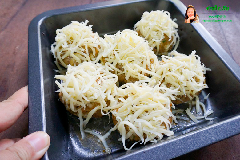 จากนั้นก็นำเข้าไปอบอีกรอบ คราวนี้ปรับอุณหภูมิให้สูงที่สุดเลย แล้วก็อบจนชีสละลาย เหลืองนิด ๆ ก็ปิดเตา ยกถาดหมูออกมาได้เลยค่า เราก็จะได้หมูก้อนอบชีสออกมาหน้าตาประมาณในภาพด้านล่างนี้นะคะ