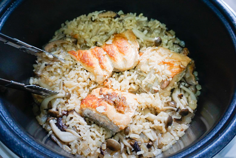 ตักข้าวใส่ลงในหม้อหุงข้าว แล้วก็ใส่โชหยุ มิริน สาเก น้ำซุป เห็ดหลินดำ และวางปลาแซลมอนที่ทอดแล้วตามลงไปนะคะ