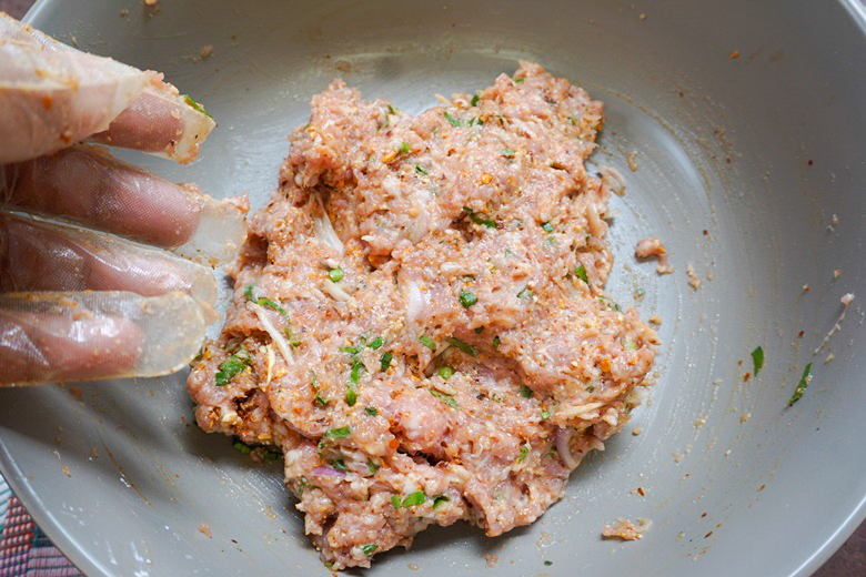 ก็ให้เราหยิบชามใบโตมาใบนึง ใส่หมูสับ แป้งข้าวโพด (ช่วยให้หมูเกาะตัวกันดีขึ้น) ข้าวคั่ว และพริกแห้งคั่วป่นลงไปนะคะ ... ตรงนี้เนี่ยถ้าใครชอบกินเผ็ด ก็ใช้เป็นพริกขี้หนูแห้งคั่วป่น แต่ถ้าใครอยากให้สีสวย ๆ กลิ่นหอมๆ เฉย ๆ และเผ็ดนิ๊ดดดเดียว ก็ใช้เป็นพริกแห้งเม็ดใหญ่คั่วป่นไปค่ะ
