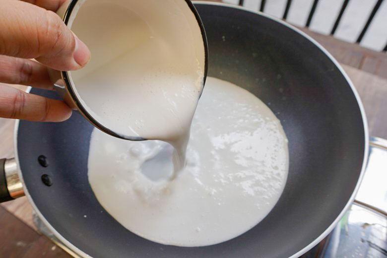 ก็ให้เราตั้งกระทะเปล่าบนเตาโดยใช้ไฟกลางค่ะ ใส่หัวกะทิลงไปเคี่ยวด้วยไฟอ่อนให้แตกมันเล็กน้อย ถ้าสมมติว่าเพื่อน ๆ ใช้กะทิกล่อง ถ้าอยากให้แตกมันสวยก็อาจจะต้องใส่น้ำมันพืชลงไปนิดหน่อยนะคะ