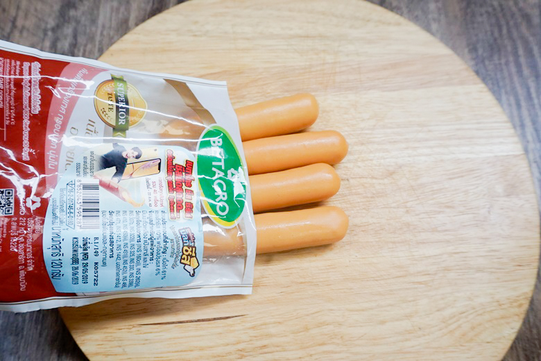 วิธีเตรียมไส้กรอกก็ไม่มีอะไรยุ่งยาก หลังจากที่เราเทไส้กรอกออกมาจากซองแล้ว ก็ให้เราใช้มีดคม ๆ บั้งไส้กรอกเป็นรอยเล็ก ๆ ตลอดความยาวไส้กรอก 2 แนวนะคะ หรือใครจะตบแต่งแนวอื่นก็ได้ เอาที่ชอบเลยค่ะ