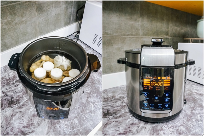จากนั้นก็ยกหม้อชั้นในไปวางในหม้ออัดแรงดัน แล้วปิดฝา ล๊อคให้สนิทนะคะ >> หมุนปุ่มเปิดปิดวาล์วไปที่ Closed >> แล้วกดปุ่มเลือกเมนู Soup >> เลือกชนิดของที่เราจะตุ๋นเป็น Meat >> เลือกระยะเวลาที่จะใช้ต้ม ซึ่งปกติถ้าเราเลือกโปรแกรมนี้ ระบบของเครื่องจะตั้งเวลาไว้ที่ 45 นาที แต่เราสามารถจะปรับเพิ่มลดเวลาได้ค่ะ