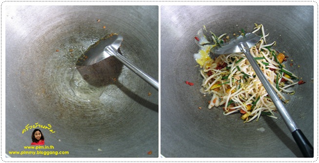 ต่อมาก็เอาน้ำมันที่เหลืออีก 1 ชต. ใส่ลงไปในกระทะ (ใบเมื่อกี้) อ่ะค่ะ แล้วก็ตอกไข่ไก่ใส่ลงไป 1 ใบ ยี ๆ ไข่ด้วยปลายตะหลิวให้ไข่แตก ... แล้วก็ใส่เกี๊ยมอี๋ที่ผัดไว้เมื่อกี้ลงไป ตามด้วยถั่วลิสงบดหยาบ ถั่วงอกกับใบกุยช่ายค่ะ