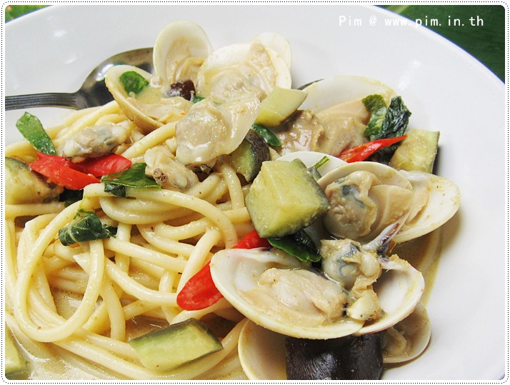แล้วก็ราดด้วยแกงเขียวหวานหอยตลับกับมะเขือม่วงลงไป ..... ปริมาณก็ตามใจชอบอีกเหมือนกันล่ะค่ะ .. แล้วเราก็จะได้อาหารจานเดียวที่ชื่อว่า "บูคาตินีราดแกงเขียวหวานหอยตลับกับมะเขือม่วง" ออกมาหน้าตาประมาณนี้นะคะ ^^