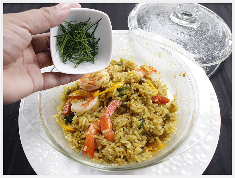 สูตรนี้ พิมจะต้มกุ้งให้สุกก่อน นำกุ้งออกมาพักไว้ แล้วไปผัดพริกแกงเขียวหวานให้หอม ผัดเสร็จก็นำข้าวสารดิบมาคลุก ใส่น้ำลงไป แล้วนำข้าวไปหุงให้สุกอ่ะค่ะ ซึ่งทั้งหมดพิมทำในไมโครเวฟล้วน ๆ นะคะ ไม่ได้ใช้เตาอย่างอื่นเลย เสร็จแล้วก็ค่อยนำมาปรุงรส ใส่กุ้งที่ต้มไว้ตอนแรก เติมผักลงไป เข้าไมโครเวฟอีกที เราก็จะได้ข้าวอบเขียวหวานกุ้งพร้อมทานแล้วล่ะค่ะ