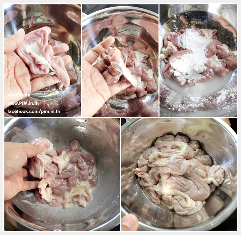 ส่วนไส้อ่อน 200 กรัม ก็ให้เราขยำรวมกับแป้งมันและน้ำส้มสายชู อย่างละ 1 ช้อนโต๊ะ พักไว้ประมาณ 10 นาที แล้วก็ล้างให้สะอาดเหมือนกับตับนะคะ