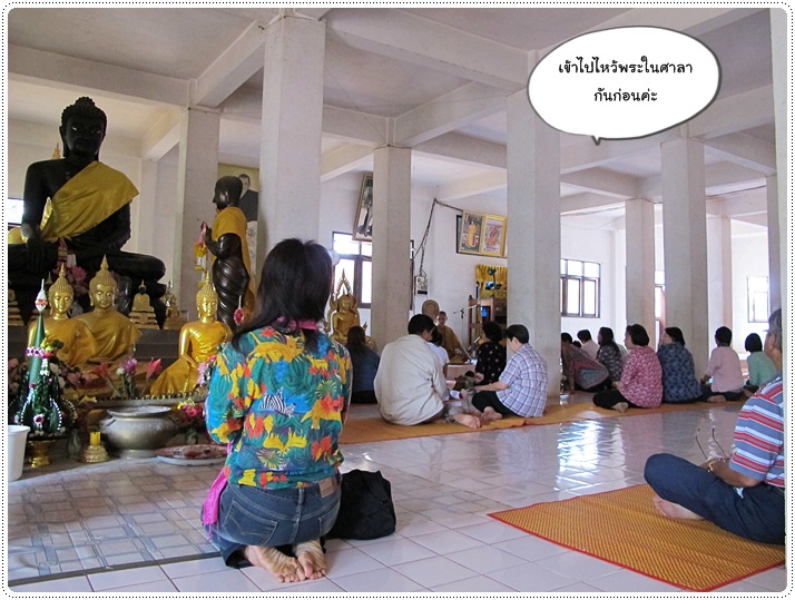 และเมื่อถึงวัดแล้ว ทางพี่ จนท. ขสมก. ก็บอกว่าให้พวกเรารีบเข้าไปไหว้พระ ถวายสังฆทานกันก่อนดีกว่า เพราะว่าอากาศเริ่มแปรปรวน ฝนเริ่มมีตกปรอย ๆ แล้วอ่ะค่ะ .... พิมกับคุณสามีที่แต่แรกคิดกันว่าจะไปเดินชมความงามภายในวัดและถ่ายรูปกันก่อนก็เลยต้องเปลี่ยนไป ทำตามคำแนะนำของพี่ จนท. แทนอ่ะค่ะ