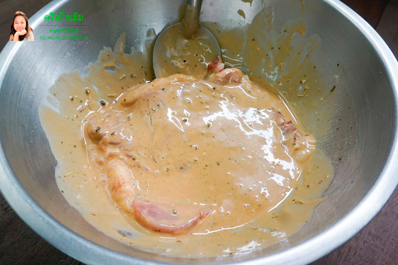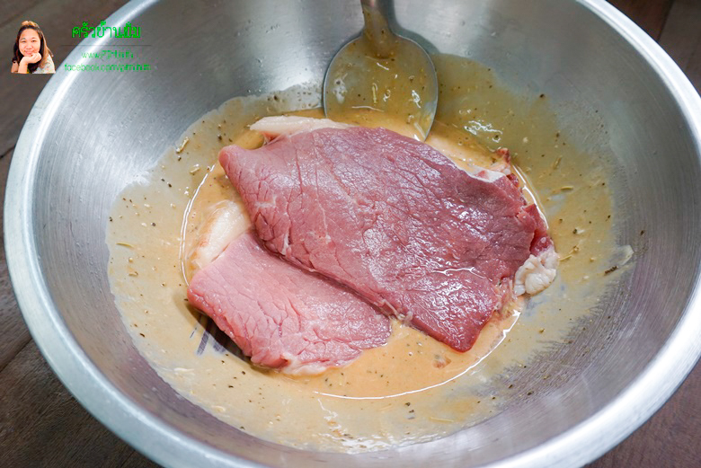 ** ควรทุบเนื้อให้ทั่วทั้งชิ้นด้วยค้อนทุบเนื้อก่อน เพื่อความนุ่มของเนื้อ