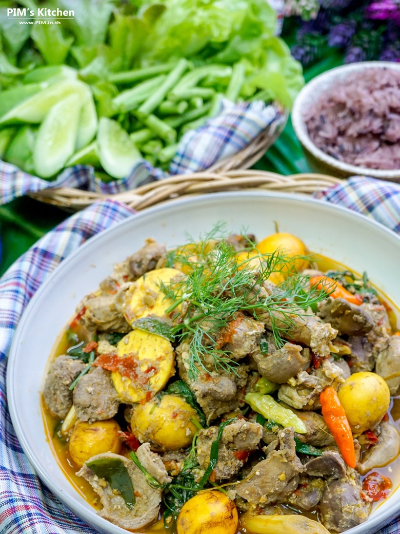จริง ๆ แล้วเมนูเครื่องในไก่หมกหม้อ แต่เดิมเค้าจะเอาส่วนผสมทุกอย่าง ไม่ว่าจะเป็นเครื่องแกง เครื่องในไก่ ผัก พริกทั้งหมด เทใส่หม้อ คนให้เข้ากัน ปิดฝา แล้วเอาไปตั้งไฟให้สุกแบบรวดเดียวจบค่ะ แต่ว่าพิมอยากให้มันออกมาหน้าตาสวยงามหน่อย อยากให้ดูน่ากิน เลยมาใส่พริก ใส่ผักทีหลัง จะได้ยังสีสวยอยู่นะคะ