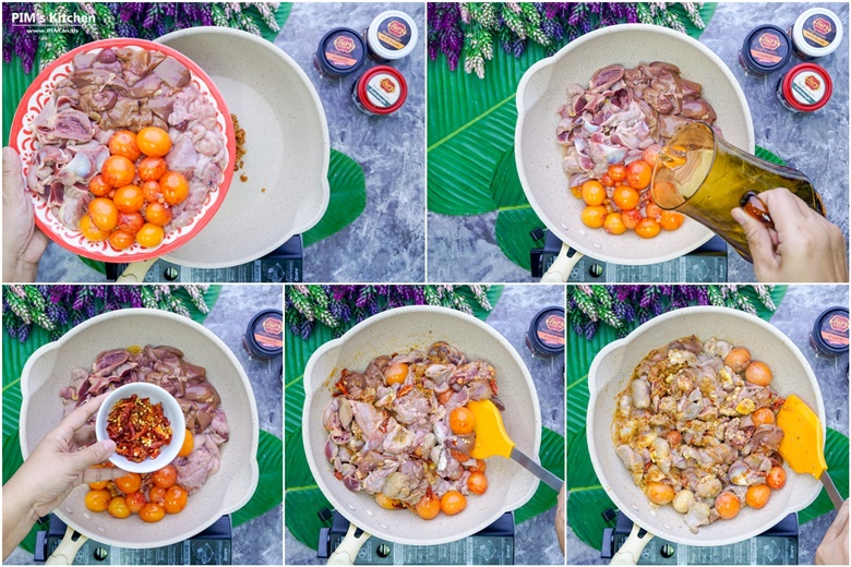 จากนั้นก็ใส่เครื่องในไก่ และพวงไข่ทั้งหมดลงไปเลยค่า ตามด้วยน้ำเปล่านิดหน่อย ประมาณ 2-3 ช้อนโต๊ะ และพริกขี้หนูแห้งตำหยาบ ๆ นะคะ (ใครไม่ชอบเผ็ดจัด จะไม่ใส่ก็ได้ หรือจะใส่น้อยกว่าที่พิมบอกก็ได้) จากนั้นใช้ตะหลิวผัดไปผัดมาสักแป๊บ พอให้เครื่องในไก่เข้ากับเครื่องแกง และสุกเล็กน้อยค่ะ