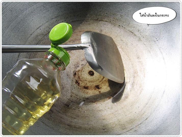 จากนั้นก็หันไปตั้งกระทะบนเตาไฟค่ะ ใส่น้ำมันพืชลงไปสัก 2 - 3 ชต.