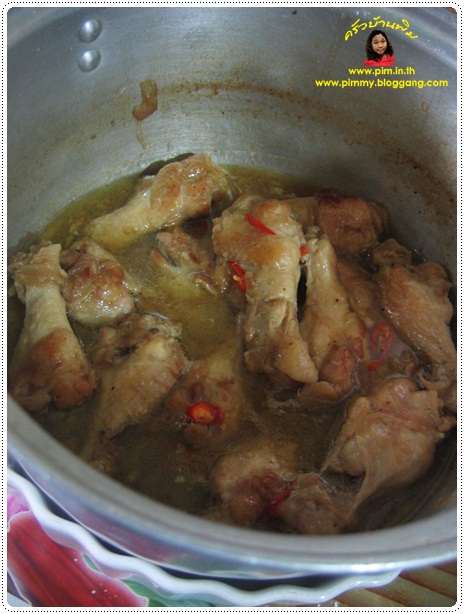 แล้วก็เทน้ำซุปใส่ลงไปให้แค่พอปริ่ม ๆ ไก่ (ถ้าไม่มีน้ำซุป ใช้น้ำสะอาด+รสดีนิดหน่อย พอแทนกันได้ค่ะ)