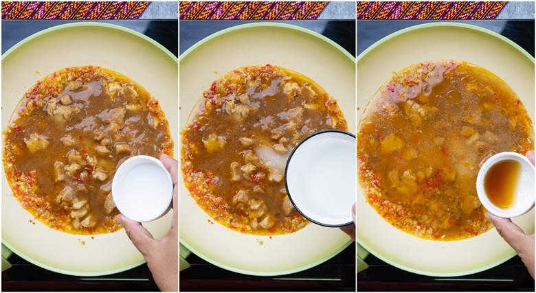 พอพริกกระเทียมส่งกลิ่นหอมดี ก็ใส่น้ำตาลปี๊บ น้ำตาลทราย น้ำมะขามเปียก น้ำกระเทียมดอง เกลือ น้ำปลา และน้ำเปล่าลงไปในกระทะนะคะ