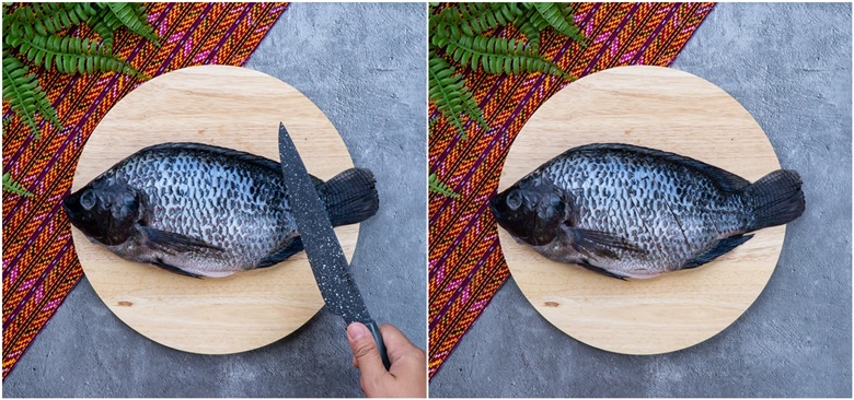 โอเค .. เมื่อได้ปลามาแล้ว ก็ให้เราเอาปลาไปล้างด้วยน้ำเปล่าสักครั้งสองครั้งนะคะ แล้วใช้มีดคม ๆ บั้งปลาด้านละ 3-4 รอย เพื่อให้เวลาทอดปลาแล้ว ปลาออกมากรอบสวยเสมอกันค่ะ