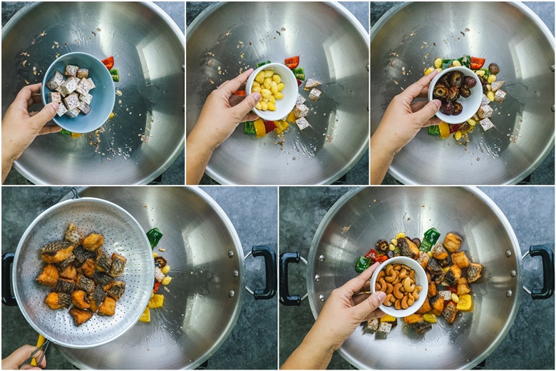 เมนูนี้เนี่ย รสชาติจะออกเค็มหวาน หอมกลิ่นน้ำมันงา หอมกลิ่นเหล้าจีน และมีรสสัมผัสหลากหลาย ไม่ว่าจะเป็นปลานิลชิ้นใหญ่ เนื้อแน่น แปะก๊วย เผือกทอดที่หนึบ ๆ พริกหวาน เม็ดมะม่วงกรอบ ๆ ... จะกินเล่น กินแกล้มเครื่องดื่ม หรือว่ากินกับข้าว พิมว่าก็อร่อยนะคะ
