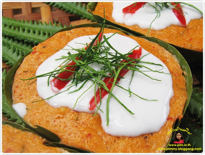 จัดการตกแต่งหน้าตาเล็กน้อยด้วยหัวกะทิ ใบมะกรูด และพริกชี้ฟ้าแดง ........... แล้วเราก็จะได้ห่อหมกเนื้อปลาอินทรีขูด ออกมาหน้าตาแบบนี้ล่ะค่ะ น่ากินไหม ^^