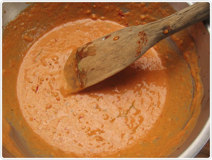 จากนั้นก็เริ่มต้นผสมส่วนผสมห่อหมกด้วยการใส่หัวกะทิลงไปในกาละมังนะคะ ใส่ยังไม่ต้องหมด สัก 2/3 ถ้วยก็พอ (ค่อยใส่เพิ่มทีหลัง) ตามด้วยพริกแกง แล้วก็ใช้ไม้พายคนให้พริกแกงละลายไปกับน้ำกะทิค่ะ (ถ้าใช้ไม้พายคนไม่ละลาย ก็ใช้ทัพพี หรือจะใช้มือลงไปบี้เลยก็ได้ค่ะ)