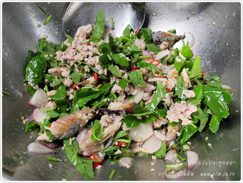 - หมูสับ 60 กรัม .......... (รวนให้สุก ใครรวนไม่เป็น ดูวิธีรวนหมูในเมนูลาบหมูนะคะ)