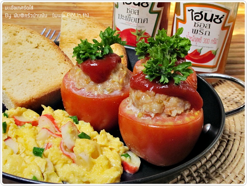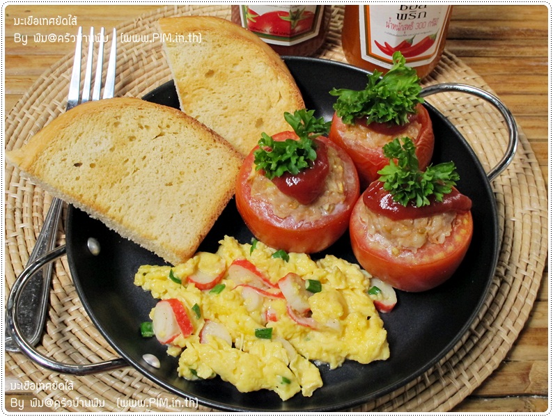 ซึ่งชุดอาหารเช้าที่พิมจัดให้คุณสามีในวันนี้เนี่ย ก็เป็นแบบง่าย ๆ ไม่ยุ่งยากค่ะ หาอะไรในตู้เย็นได้ก็เอาอย่างนั้นเลย เริ่มจากตอนก่อนจะนอนพิมทำขนมปังไว้ก่อนค่ะ (ทำโดยเครื่องทำขนมปัง ใช้เวลา 3 ชม.ครึ่ง) พอตื่นเช้ามาพิมก็ทำมะเขือเทศยัดไส้อบค่ะ พอบอบเสร็จก็ทำไข่คน กับปิ้งขนมปัง ... แล้วพอทุกอย่างเสร็จ ก็จัดใส่จานให้คุณสามี เสริฟพร้อมซอสมะเขือเทศ (ส่วนซอสพริกเอามาประกอบฉาก) และโอวัลตินร้อน ๆ 1 แก้ว ...... ก็ได้เป็นอาหารเช้าชุดสุดเลิฟที่มีคุณค่าสารอาหารครบถ้วนให้คุณสามีแล้วอ่ะค่ะ โดยวิธีทำขนมปังกับวิธีทำไข่คนนั้นพิมไม่ขอเอ่ยถึงนะคะ แต่จะขอเอ่ยถึงเฉพาะวิธีการทำมะเขือเทศยัดไส้ ซึ่งพิมคิดว่ายากที่สุดในบรรดาอาหารทั้งหมดในจานนี้แล้วอ่ะค่ะ ^____^