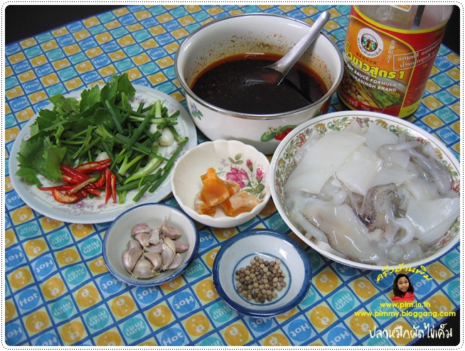 - ปลาหมึก 3 ตัวใหญ่ ๆ (ตัวยาวประมาณ 1 คืบ) ...... บั้งให้สวยงาม แล้วหั่นเป็นชิ้น 1*2 นิ้ว
