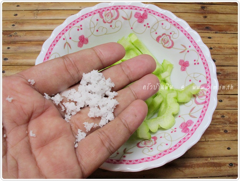 พอหั่นเสร็จก็ใส่เกลือป่นแบบหยาบๆ (ที่ขายซองละ 1-2 บาท) ลงไปในมะระประมาณ 1 ชช. แล้วเคล้ากับมะระให้ทั่วกัน
