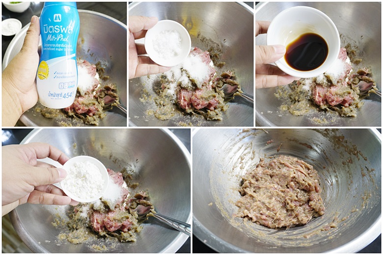 ปรุงรสด้วยน้ำตาลทราย เกลือป่น ซีอิ๊วขาว น้ำมันงา แป้งข้าวโพด แล้วนวดทุกอย่างให้เข้ากันดี จนส่วนผสมมีความหนึบนะคะ
