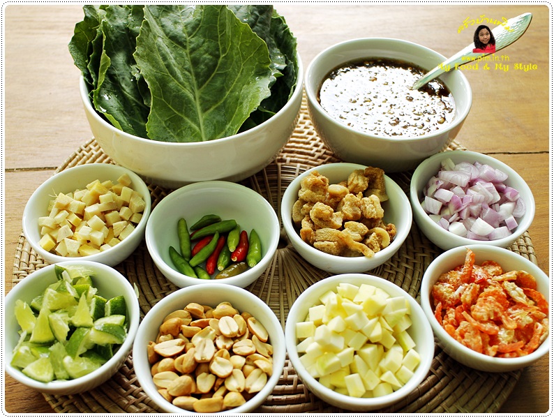 สำหรับเมี่ยงคะน้าเนี่ย .... จะว่าไปก็คล้ายกับเมี่ยงปลาช่อนทอดที่พิมเคยทำลงเวบไปแล้ว แต่เมี่ยงคะน้าจะใช้ใบคะน้าอ่อนๆ แทนใบชะพลู และใช้กากหมูเจียวใหม่ ๆ แทนปลาช่อนทอดอ่ะค่ะ .... ยังไงไปลองทำกันดูนะคะ ^_^