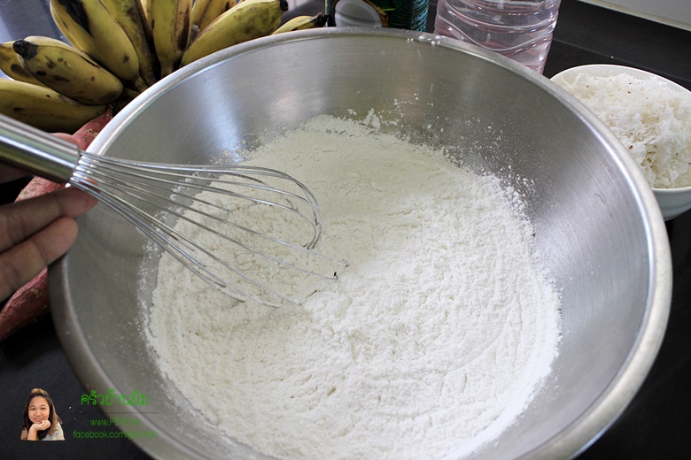 เริ่มต้นเรามาผสมแป้งที่จะใช้ชุบกล้วย ชุบมันทอดกันก่อนนะคะ