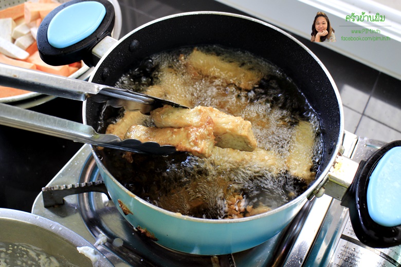 จากนั้นหันมาตั้งหม้อหรือกระทะก้นลึกบนเตาไฟ ใส่น้ำมันสำหรับทอดลงไปให้สูงสักประมาณ 3-4 นิ้ว แล้วก็เปิดไฟกลางนะคะ .... พอน้ำมันร้อน แต่ไม่ต้องให้ร้อนจัดมาก ก็หยิบกล้วย เผือก มัน แต่ละชิ้น ลงชุบกับแป้ง แล้วหย่อนใส่ลงไปในหม้อทอดค่ะ
