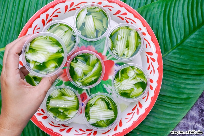 แล้วตักวุ้นใบเตยของเราใส่ลงไปในถ้วยนะคะ