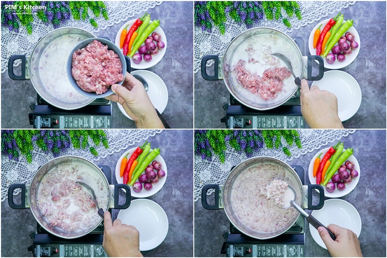 พอกะทิเดือดดี ก็ปิดไฟเตาก่อน แล้วใส่ตะไคร้กับหอมแดงซอยลงไปนะคะ