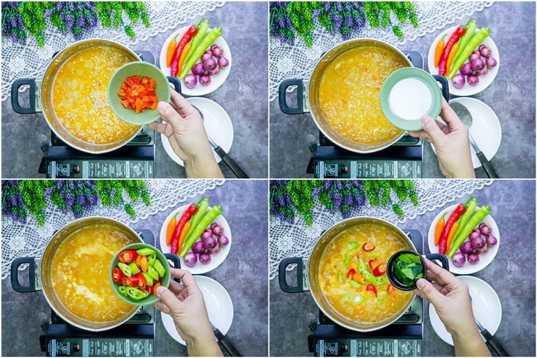 เมื่อได้รสที่ชอบแล้ว ก็ใส่ไข่แดงเค็มหั่นชิ้น หัวกะทิ พริกชี้ฟ้าหั่น และใบมะกรูดลงไป