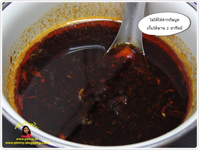 จากนั้นก็ให้เราตั้งกระทะค่ะ ใช้ไฟกลาง ใส่น้ำมันสำหรับผัด และก็น้ำพริกเผาที่เราตำไว้เมื่อกี้ลงไป ...... แล้วก็ผัดๆ ไปเรื่อย ๆ ค่ะ ถ้าน้ำพริกเผาแห้ง ก็เติมน้ำมันลงไปได้อีก ปริมาณน้ำมันเนี่ยตามชอบเลยนะคะ .... ก็ผัดไปประมาณสัก 1/2 ชม. น้ำพริกเผาเริ่มจับตัวกันเป็นก้อน ก็จะใช้ได้ค่ะ (แต่ถ้าน้อย ๆ สัก 20 นาทีก็พอ)