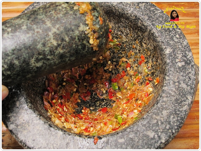 อันดับแรกเลย เราก็มาโขลกพริกผัดเผ็ดกันก่อนนะคะ โดยขั้นแรกก็ให้เราโขลกพริกไทยป่นก่อนนะคะ โขลกไม่ต้องให้ป่นมากนะคะ เอาพอแตกๆ แล้วก็ใส่หอมแดงที่หั่นเป็นชิ้นเล็ก กระเทียมและเกลือลงไป โขลกจนหอมแดงแหลก ไม่เห็นเป็นชิ้น ก็ใส่พริกขี้หนูสวนและพริกขี้หนูแดงเม็ดใหญ่ตามลงไป โขลกจนละเอียดประมาณในภาพก็ใช้ได้ล่ะค่ะ หรือถ้าใครจะใช้วิธีลัดด้วยการหั่นรวมในเครื่องปั่นเลยก็ได้อีกเช่นกันค่ะ .. โขลกเสร็จ ก็ตักใส่ถ้วยพักไว้ก่อนนะคะ