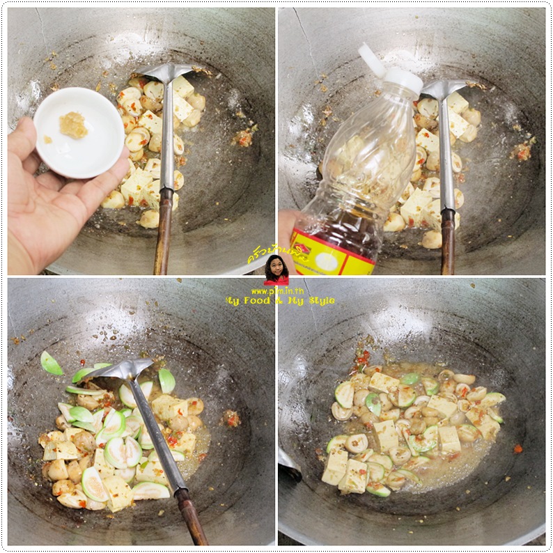 ผัดไปผัดมา 2-3 ที่ (ไม่ต้องผัดนานเพราะเต้าหู้สุกแล้ว ส่วนเห็ดนั้นสุกง่ายมาก) ... ก็ปรุงรสด้วยน้ำตาลปี๊บ น้ำปลา ใส่มะเขือเปราะที่เราหั่นชิ้นและน้ำซุป/น้ำเปล่าตามลงไป